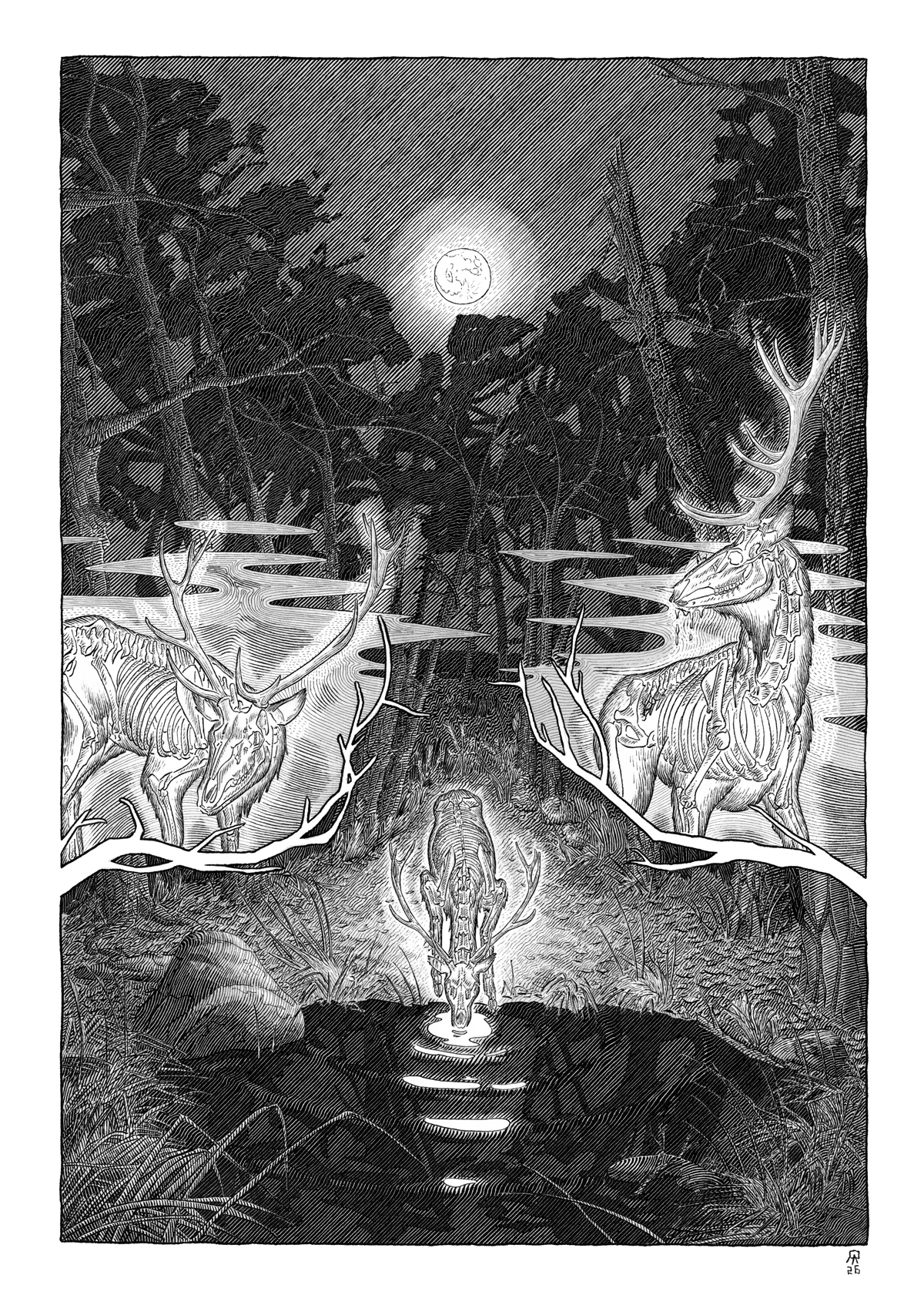 Second test d’un “haïku fantastique BD”. J’ai déjà rencontré divers animaux lors de mes balades en forêt, surtout la nuit. Chacune de ces rencontres m’ont paru aussi surréaliste que dans ce dessin. Est-ce parce que la vie sauvage est magnifique ou parce qu’elle est trop rare et mourante ? J’imagine que je peux être triste et heureux à la fois.