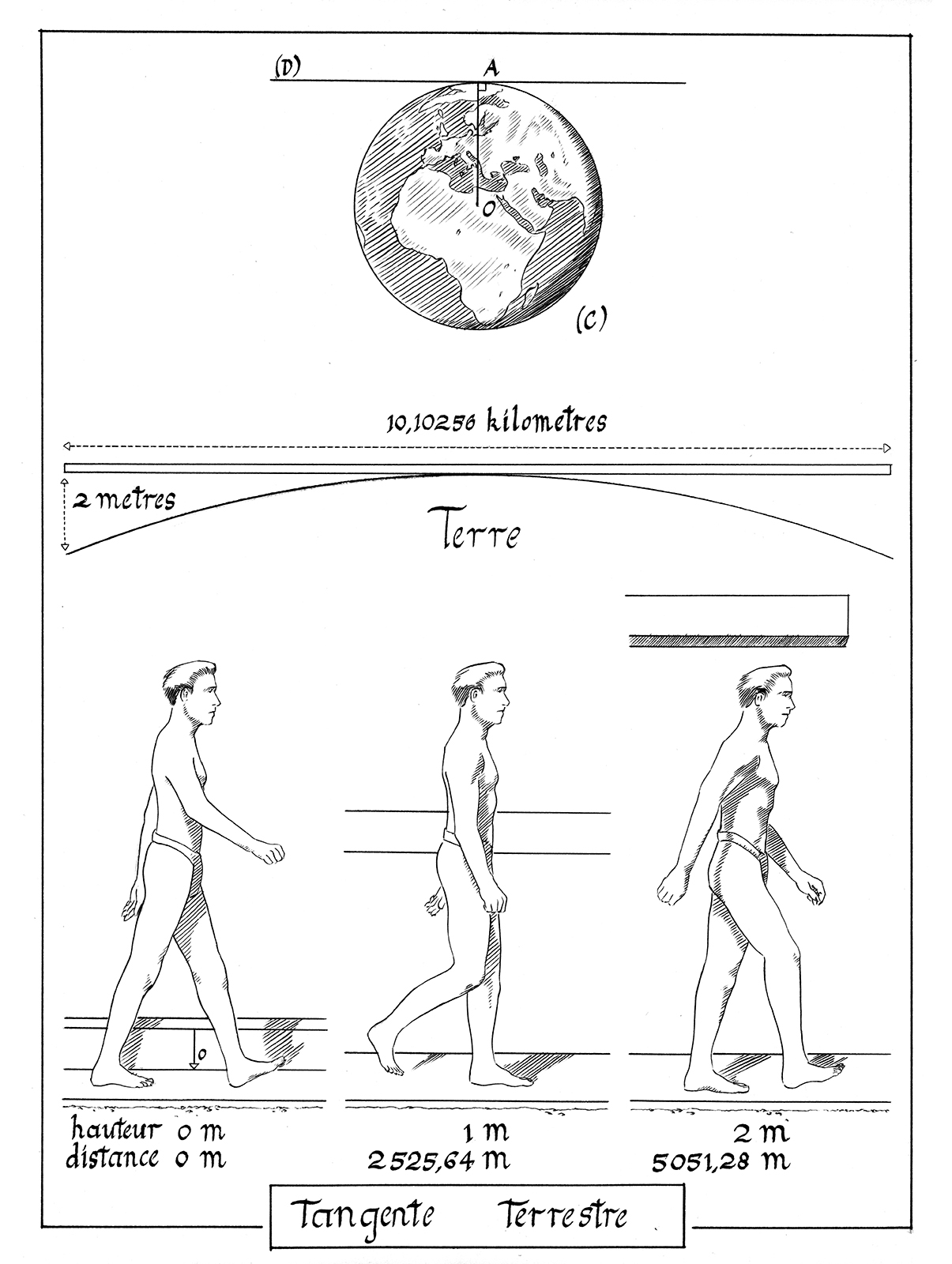 Et si on construisait une tangente de la terre ? Une telle droite se doit de faire 10 kilomètres, 96 mètres et 34 centimètres de long afin d’obtenir un espacement de 2 mètres entre ses extrémités et la terre.